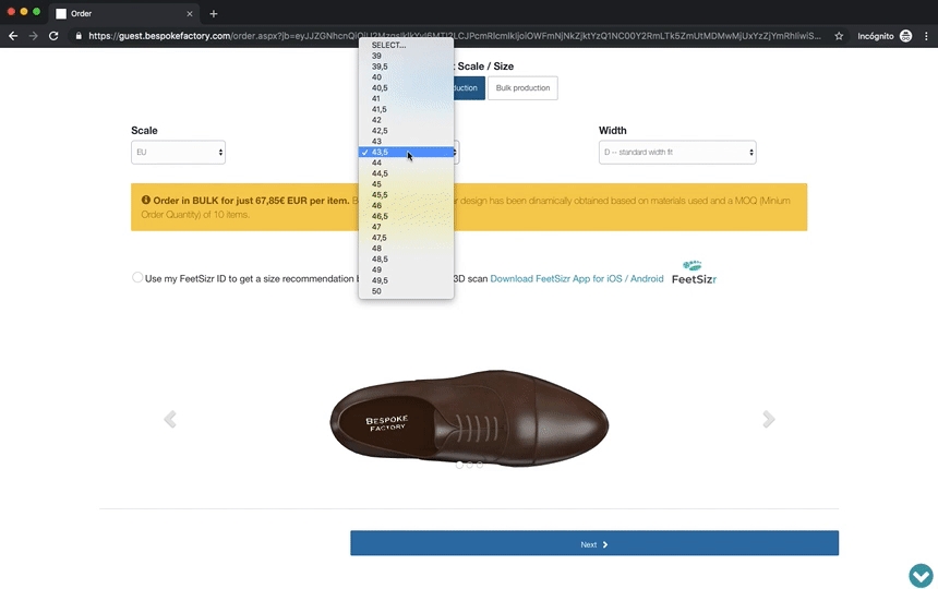 Instead of submitting payments, and ship orders individually, you are entitled to group several MTO orders together for invoicing and shipping purposes using our “Group Shipping” feature, which will reduce your shipping costs per pair.