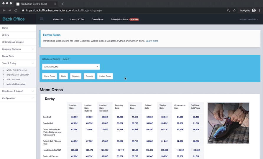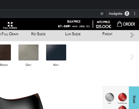 The dynamic price widget provides a real-time bulk price quotation based on the style combination in process that you see on-screen. Right after each modification made (materials, sole unit, accessories…etc) prices are automatically re-calculated in real-time